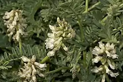 Este milkvetch é uma erva perene que vive 5 a 10 anos. O caule grosso e avermelhado é levemente piloso nas pontas, crescendo de 30 a 90 centímetros de comprimento. As folhas amplamente espaçadas estão dispostas de forma oposta ao longo do caule. Cada um tem até 16 centímetros de comprimento e é composto por vários pares de folíolos ovais de até cerca de 2 centímetros de comprimento. A inflorescência é um aglomerado denso de 10 a 40 flores brancas semelhantes a ervilhas. A planta é autopolinizadora e as flores também são polinizadas por abelhas nativas. A fruta é uma cápsula de legume dobrada de 1 a 1,5 centímetros de comprimento que seca até uma textura de papel.