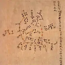 Mapa de Dunhuang da Dinastia Tang. Acredita-se que o mapa data do reinado do Imperador Zhongzong de Tang. As constelações das três escolas são distinguidas em cores diferentes (branco, preto, e amarelo), para estrelas de Wu Xian, Gan De e Shi Shen, respectivamente. O conjunto de mapas incluía 1,3 mil estrelas.