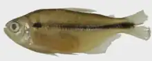 As escamas são prateadas. As barbatanas são em grande parte vermelhas, com coloração mais intensa na barbatana caudal e nos raios anteriores da barbatana anal.[9] Há uma mancha umeral escura em formato oval horizontal e duas barras verticais marrom-escuras na mesma região do corpo. Uma mancha escura no pedúnculo caudal se estende até as pontas dos raios médios da nadadeira caudal. Talvez a característica mais marcante seja a faixa lateral escura, que possui uma borda prateada brilhante.[4]