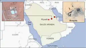 O ataque em Abqaiq-Khurais de 2019 foi um ataque de drones que atingiu as fábricas de petróleo da Saudi Aramco de Abqaiq (Biqayq em árabe) e Khurais no leste da Arábia Saudita em 14 de setembro de 2019.[6] O ataque causou grandes incêndios nas fábricas, que foram apagados após várias horas, de acordo com o Ministério do Interior da Arábia Saudita. O movimento Houthis no Iêmen assumiu a responsabilidade pelo ataque, vinculando o ataque aos eventos que envolveram a intervenção da Arábia Saudita na Guerra Civil Iemenita. No entanto, as alegações de autoridades dos Estados Unidos de que os ataques foram originados no Irã, apesar da negação do país, também vincularam o evento a atual crise do Golfo Pérsico.[1]