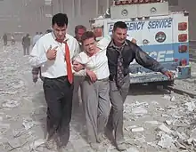 Um total de 411 trabalhadores de emergência que responderam aos chamados de socorro morreram quando tentavam resgatar as pessoas e apagar os incêndios. O Corpo de Bombeiros da Cidade de Nova Iorque (FDNY) perdeu 341 bombeiros e dois paramédicos.[45] O Departamento de Polícia da Cidade de Nova Iorque (NYPD) perdeu 23 funcionários.[46] O Departamento de Polícia da Autoridade Portuária perdeu 37 oficiais,[47] e 8 EMTs adicionais e paramédicos de unidades privadas de serviços de emergência foram mortos.[48][49]