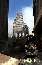 Três dos prédios do Complexo do World Trade Center desmoronaram devido a uma falha estrutural, no dia do ataque.[24] A Torre Sul (WTC 2) caiu às 9h59, após queimar por 56 minutos em um incêndio causado pelo impacto de Voo 175 da United Airlines.[24] A Torre Norte (WTC 1) desmoronou às 10h28min, após queimar por aproximadamente 102 minutos.[24] Quando a Torre Norte desabou, os escombros caíram próximo à World Trade Center 7 (WTC 7), danificando o edifício e iniciando um incêndio. Estes incêndios queimaram durante horas e comprometeram a integridade estrutural do edifício, levando-o ao colapso total às 17h21min.[25][26]