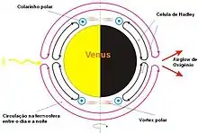A atmosfera de Vénus está num estado vigoroso de circulação e super-rotação, e circula o planeta inteiro em apenas quatro dias terrestres, muito mais rápido que a rotação do planeta de 243 dias. Os ventos que produzem a super-rotação atingem velocidades de mais de 100 m/s (360 km/h)[4] e se movem a uma velocidade 60 vezes maior que a rotação do planeta, enquanto que na Terra os ventos mais rápidos atingem de 10% a 20% da velocidade de sua rotação.[5] Por outro lado, o vento fica cada vez mais lento conforme a elevação da superfície diminui, com a brisa mal chegando à velocidade de 10 km/h na superfície.[6] Perto dos polos existem estruturas anticiclônicas chamadas vórtices polares. Cada vórtice possui dois olhos e apresenta um padrão de nuvens característico em forma de S.[7]