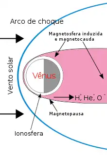 Vênus não tem um campo magnético. O motivo para sua ausência é desconhecido, mas provavelmente está relacionado com a pequena velocidade de rotação do planeta ou com a falta de convecção no manto. O planeta tem somente uma magnetosfera induzida formada pelo campo magnético do Sol levado pelo vento solar. Esse processo pode ser entendido como o campo magnético encontrando um obstáculo, Vênus nesse caso. A magnetosfera induzida de Vênus tem um bow shock, magnetobainha, magnetopausa e magnetocauda.[25][26]