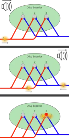 Os núcleos olivares superiores do tronco cerebral apresentam grande participação na detecção do som. O núcleo olivar superior pode ser dividido em duas partes: o núcleo olivar superior medial e o núcleo olivar superior lateral. O núcleo lateral é responsável pela detecção da direção de emissão sonora, presumidamente por comparação da diferença de intensidade sonora recém chegada ao ouvido e pela emissão de sinal apropriado do córtex auditivo, para estimar a direção.[17] Alternativamente, o núcleo medial tem mecanismos específicos para detectar o intervalo de tempo entre sinais acústicos que entram nos dois ouvidos.[18] A maioria dos neurônios do núcleo medial apresentam dois dendritos principais, um se projetando para a direita e outro para a esquerda. O sinal acústico do ouvido direito invade o dendrito direito e o sinal acústico do ouvido esquerdo invade o sinal do dendrito esquerdo. A intensidade de excitação dos neurônios são altamente sensíveis ao intervalo de tempo específico entre os dois sinais acústicos percebidos no ouvido. Os neurônios mais próximos ao perímetro do núcleo respondem em sua plenitude a um intervalo curto de tempo, enquanto os próximos da borda oposta respondem a intervalos longos e os intermediários, a intervalos intermediários. Assim, um padrão espacial de estimulação neuronal no núcleo olivar superior medial pode ser desenvolvido, o que será enviado ao córtex cerebral auditivo, onde a direção do som é determinada pelo local dos neurônios estimulados maximamente.[19]