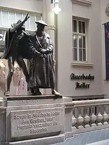 Durante o seu tempo de estudante em Leipzig entre 1765 e 1768 Goethe esteve muitas vezes no Auerbachs Keller. Quando então Goethe terá visto as duas figuras em madeiras criadas por volta de 1625, sobre as quais o alquimista, mago e astrólogo Dr. Johann Georg Faust com os estudantes se fartara de beber vinho e cavalgou – por cima dos outros – montado numa pipa de vinho até à porta da rua, um feito que só poderia ter sido realizado com a ajuda do Diabo. A lenda do Dr. Johann Georg Faust, já era conhecida de Goethe desde os seus dias de infância através do Teatro de Títeres do Dr. Fausto, a qual era representada nas feiras. Na cena „Auerbachs Keller in Leipzig” em Fausto 1ª parte Goethe dedicou ao seu restaurante preferido dos tempos de estudante e à cidade de Leipzig um marco literário duradouro: „Mein Leipzig lob ich mir! Es ist ein klein Paris und bildet seine Leute.“ (Minha Lípsia eu me louvo! É uma pequena Paris e instrui a sua gente.)