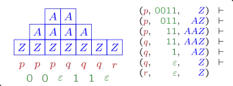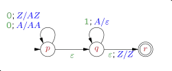 Como resultado, obtemos um autômato com pilha de um único estado. O estado aqui é , aceitando a linguagem livre de contexto por pilha vazia. O símbolo inicial da pilha é igual ao axioma da gramática livre do contexto.