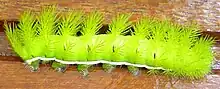Assim que eclodem, alimentam-se as pequenas lagartas do córion, ficando então as lagartas agrupadas numa folha por cerca de um dia no qual não se alimentam; seu desenvolvimento dá-se em seis ínstares, sendo que as fêmeas ficam maiores, sobretudo a partir do quarto ínstar; a duração da fase larval é de cerca de vinte dias e podendo chegar a 7 cm de comprimento, quando então tornam-se pupas.[1] Embora não haja registros de canibalismo, como as demais Hemileucinae se alimentam das exúvias.[1] Quando incomodadas as lagartas eriçam seus escolos, e emitem um som de estalo; soltam-se da planta e se contorcem no chão; quando uma das larvas assume a posição de defesa, as demais também assumem essa postura, uma vez que durante o dia se reúnem em grupo ou em duplas na face inferior das folhas quando ainda são pequenas, provavelmente como forma de camuflagem.[1]