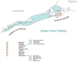 A Avalónia desenvolveu-se a partir de um arco vulcânico na margem norte do Gondwana. Eventualmente, ocorreu um rifte, tornando-se um microcontinente à deriva. Atrás dele formou-se o Oceano Reico, comprimindo o Oceano de Jápeto à sua frente. Colidiu com a Báltica, depois com a Laurência e finalmente com Gondwana, acabando no interior da Pangeia. Quando a Pangeia se fragmentou, as partes da Avalónia foram divididas pelo rifte que se tornaria o oceano Atlântico.