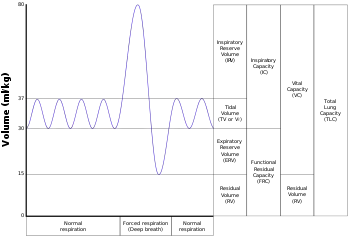 Típico resultado de uma espirometria de uma pessoa normal com 4 ventilações, seguidas de inspiração e expiração máximas.