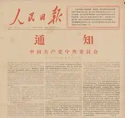 O Aviso de 16 de maio (chinês:五一六通知; pinyin : Wǔyīliù Tōngzhī) ou Circular de 16 de maio, oficialmente Notificação (chinês :通知; pinyin: Tōngzhī), foi a primeira grande declaração política da Revolução Cultural Chinesa. Foi publicado em uma sessão ampliada de maio de 1966 do Politburo do Partido Comunista Chinês. A Notificação de 16 de maio encerrou uma disputa política dentro do PCC. O resultado foi uma vitória política para Mao Zedong. A Notificação é muitas vezes vista como o início da Revolução Cultural.[2]