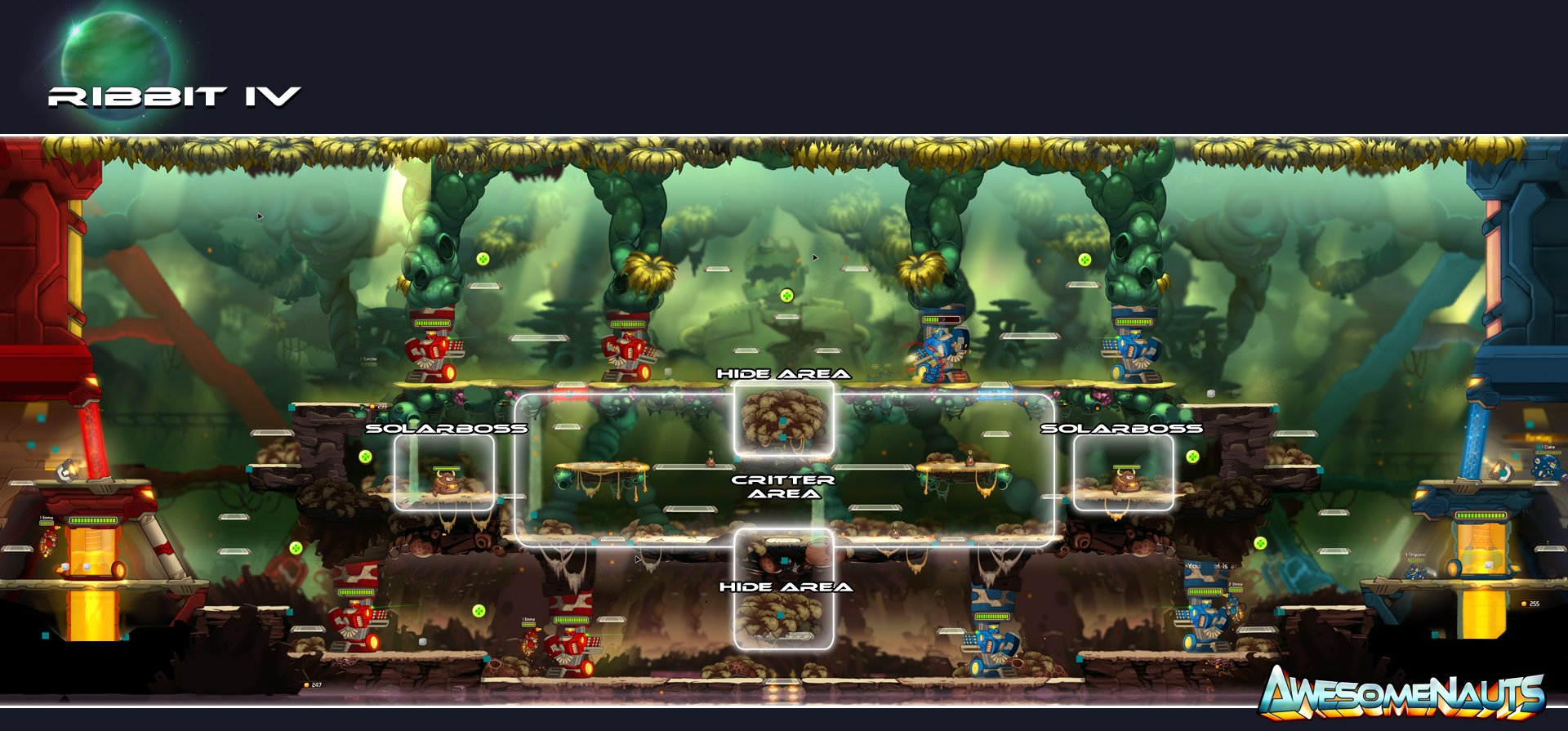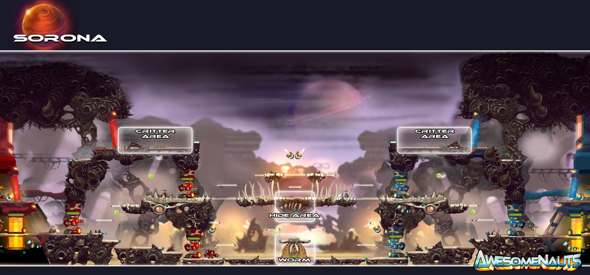 3º: Sorona. A principal mudança deste mapa aos outros é uma minhoca gigante que fica na parte central abaixo do mapa, toda vez que a escotilha ela sai e mata qualquer awesomenaut ou qualquer outra coisa. (é acionada por um botão logo acima da mesma)