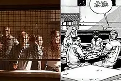 ![]() Os prisioneiros retratados na série de televisão (esquerda) e série de quadrinhos (direita). | |