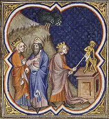 Ilustração de Petrus Comestor na Bíblia Historiale, do Rei Asa destruindo os ídolos, conforme o estímulo dado por Azarias. França, 1372.