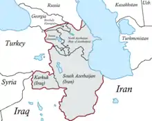 - Sul do Azerbaijão (Cənubi Azərbaycan) - províncias iranianas do Azerbaijão Oriental, Azerbaijão Ocidental, Ardabil e Zanjan