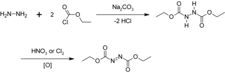 Embora disponível comercialmente, azodicarboxilato de dietila é frequentemente preparado fresco no laboratório, especialmente se necessário na forma pura, não diluída. Uma síntese de duas etapas começa a partir de hidrazina, primeiro por alquilação com cloroformato de etila, seguido pelo tratamento do resultante hidrazodicarboxilato de dietila com cloro (borbulhado através da solução), ácido hipocloroso, ácido nítrico concentrado ou ácido nítrico fumegante vermelho. A reação é realizada em um banho de gelo, e os reagentes são adicionados gota a gota para que a temperatura não se eleve acima de 20 °C. Hidrazodicarboxilato de dietila é um sólido com uma temperatura de fusão de 131–133 °C o qual é coletado como um resíduo; é significativamente mais estável ao aquecimento que DEAD e é convencionalmente seco a uma temperatura de aproximadamente 80 °C[9][12]