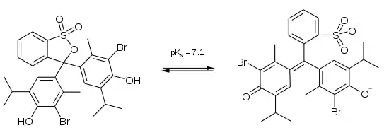 Azul de bromotimol atua como um ácido fraco em solução. Pode então se apresentar na forma protonada ou deprotonada, amarela e azul, respectivamente.
