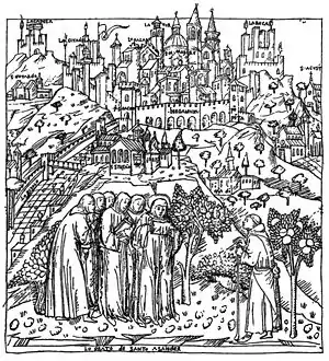 Pregação de Santo Alessandro, 1450. Vista de Bergamo, com a "Cidade Alta" ao fundo
