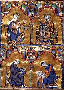 A seção inferior da miniatura mostra duas pessoas, menores em tamanho (portanto, mais baixas na classificação). A figura da esquerda é um clérigo, como pode ser visto em sua tonsura. O homem à direita é um escriba e está trabalhando em uma Bíblia Moralisée, como pode ser visto no layout da página. É óbvio que o clérigo está dando instruções ao escriba e supervisiona o trabalho na Bíblia. A aparência do clérigo sugere que ele é membro de uma ordem religiosa.