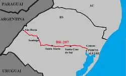 Inicia na Região de Porto Alegre, na cidade de Montenegro. Passam pelo Centro Oriental,Centro Ocidental e terminando na região Sudoeste, na cidade de São Borja. Sua extensão é de 536,9 km.