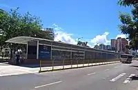 O projeto, que já teve o trecho da Almirante Barroso liberado para os ônibus expressos, foi concebido de forma incompleta e hoje prevê mais quatro trechos: Augusto Montenegro, Centenário, Centro de Belém e Centro de Icoaraci, totalizando 55 quilômetros de corredores exclusivos para os ônibus do BRT, o que atenderia assim, a outras partes da cidade[18]. Fase experimental![]() Ônibus do BRT Belém, entrando no terminal no primeiro dia da fase experimental em 2016. ![]() Estação Antônio Baena, uma das primeiras estações inauguradas para o novo sistema. Após este primeiro período, os ônibus do BRT já começaria a integração com linhas expressas pela avenida Augusto Montenegro. Na segunda etapa, os ônibus articulados do BRT seriam somados ao sistema de transporte convencional. A partir desta fase, o "passageiro poderá optar em seguir pelas linhas convencionais, fazer a integração com os ônibus articulados ou até mesmo seguir viagem pela via expressa do BRT, pagando apenas uma única tarifa no valor de R$ 2,70”, segundo o diretor geral da SEMOB Gilberto Barbosa[21]. Terminais de Integração![]() Terminal de Integração do Mangueirão no início da fase experimental do BRT. No sistema troncal do BRT Belém quando completo teria três grandes terminais de integração com acesso a linhas alimentadoras, linhas integradoras e linhas semi-expressas. Terminal Mangueirão - localizado em frente ao Estádio Olímpico do Pará, para atender bairros próximos. É o primeiro terminal a ser entregue com previsão de termino completo das obras para o segundo semestre de 2016, e utilizado pela população para a fase experimental do BRT no mês de Julho. Terminal Tapanã - Dos três terminais de integração, esse será o único que ficará localizado no meio da Rodovia Augusto Montenegro, no cruzamento com as Rodovia Mário Covas e Rodovia do Tapanã, este terminal está projetado para atender bairros e conjuntos como Tapanã, Cordeiro, Satélite, Tapajós, Maguari, Tenoné entre outros. Sua construção começou no início de 2017 e terminou em outubro de 2018. Terminal Maracacuera - Este é o último terminal da linha troncal do BRT Belém e atende os bairros e conjuntos da Maracacuera, Campina, Paracuri I e II, Cohab além de integração fluvial via portos como Ilha de Cotijuba, e Ilha de Caratateua. Começou a operar em Outubro de 2019, e passou a se o ponto final de linhas do distrito de Outeiro que iam em direção ao centro da cidade, essas linhas passaram a ser linhas alimentadoras. ![]() Estação São Brás, inaugurada e aberta em Junho de 2017. Estação São Brás (Terminal São Brás) - é uma grande Estação (Terminal) na área da Praça da Leitura no bairro de São Brás, esta estação serve como ponto final dos ônibus articulados do BRT enquanto não sai o projeto do BRT-Centro Belém. Sendo este o ponto final os ônibus irão a partir dali fazer a viagem de volta ao terminal do mangueirão, a estação servirá futuramente também como integração entre linhas alimentadoras, a Estação possuí duas estruturas sendo uma para desembarque no início da Av. Governador José Malcher e a maior estrutura que compreende inteiramente a Av. Almirante Barroso em frente ao Terminal Rodoviário. Outros trechos do BRT BelémA Prefeitura Municipal de Belém após a inauguração da 1ª Etapa do BRT apresentou em audiências públicas novos trechos do BRT Belém, sendo eles o BRT Centro-Icoaraci, BRT Centro-Belém além do BRT Centenário[22].
