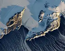 Imagem de satélite da Baía Terra Nova ao fundo, com a Ilha Inexpressible à esquerda.