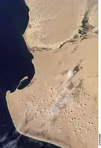 Muito bem protegida, em suas margens há falésias de arenito de até 41 metros de altura, que se erguem no início da chamada ponta do Porto (ou ponta Bateman), o promontório que guarda o "saco do Porto", uma micro-baía dentro da baía de Porto Alexandre, formação geográfica que permite a existência do porto de Tômbua. Outra formação interna em forma de micro-baía é o "saco do Pinda", formado pela ponta do Pinda.[2]