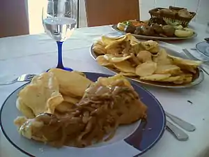 Consiste em postas de bacalhau polvilhadas com pimentão e fritas em óleo. No mesmo óleo, são fritas batatas cortadas em rodelas grossas. Por fim, são fritas lentamente em azeite rodelas finas de cebola, que são colocadas sobre o bacalhau, antes de servir. O prato final pode ser enfeitado com azeitonas e acompanhado por grelos.[1]