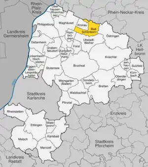 ![]() <div style="position: absolute; z-index: 2; top: Erro de expressão: Operador < inesperado%; left: 31.5%; height: 0; width: 0; margin: 0; padding: 0;"> Bad Schönborn Mapa da Alemanha, posição de Bad Schönborn acentuada |