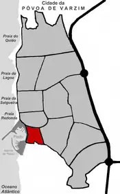 Este bairro limita a norte com a zona Centro, a nascente com Matriz/Mariadeira, a sul com a Cidade de Vila do Conde, nomeadamente as zonas de crescimento do Bairro Sul para essa cidade (Poça da Barca e Caxinas) com as quais partilha traços característicos, a poente encontra-se o oceano Atlântico, com o porto de Pesca da Póvoa de Varzim.