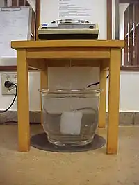 - Pesa-se o mineral imerso em água, o que é conseguido pendurando o mineral em um fio amarrado em um dispositivo ligado ao prato da balança. O recipiente com água onde será imerso o mineral deverá ficar sobre o prato da balança, sem tocá-lo, o que se consegue com uma plataforma ponte, apoiada sobre a mesa onde está a balança.