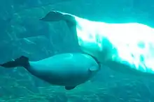 - Visão: São capazes de ver dentro e fora da água; no entanto, ao comparar-se com os golfinhos, a visão é relativamente pobre.[50] Seus olhos estão adaptados de forma particular para ver dentro da água, mas ao contato com o ar, o cristalino e a córnea são ajustadas para corrigir a miopia (o alcance de visão dentro da água é curto).[50] A retina do animal possui cones e bastões, o que indica que também podem ver na penumbra. A presença de cones sugere que podem ver as cores; no entanto, esta suposição não foi documentado.[50] Algumas glândulas no canto medial das órbitas segregam uma substância gelatinosa e oleosa, que lubrificam o olho e limpam de corpos estranhos. Esta substância forma uma película que protegeria a córnea e a conjuntiva de organismos patogênicos.[50]