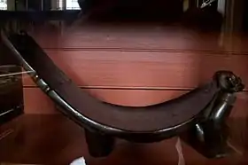 O assento é feito a partir da madeira dura chamada Lignum vitae (Gaïac) oriunda da árvore . In this case the Lignum vitae is from the Guaiaco.[1] As flores dessa árvore são a flor nacional da Jamaica..[2] A pequena cadeira pequena foi feita na forma animalesca de um homem de quatro patas. A cabeça é decorada com ouro e a figura é esculpida com órgãos genitais masculinos embaixo.[3]