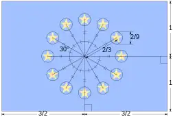 - Localização das estrelas: Doze estrelas douradas, colocadas a intervalos regulares, formam uma circunferência invisível, cujo centro é o ponto de intersecção das diagonais do retângulo. O raio da circunferência é igual a um terço da altura do retângulo.[43]