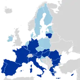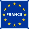 As estrelas europeias são também utilizadas nas fronteiras dos países que fazem parte do Espaço Schengen. O nome do país está escrito no idioma oficial do país e com as estrelas europeias a rodear.