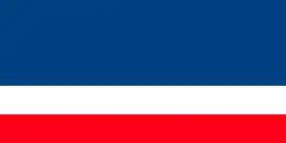 As estrelas douradas estão dispostas em um triângulo equilátero em um fundo azul. A distância do centro da primeira estrela até a haste é de 30 cm, a distância do centro da mesma estrela até as bordas da faixa azul em largura e a distância dos centros das estrelas em relação umas às outras é de 30 cm. O diâmetro do círculo circunscrito da estrela é de 15 cm. A proporção entre a largura e o comprimento da bandeira é de 1:2".