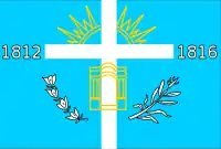 O desenho da bandeira anterior consiste em retângulo de proporção comprimento-largura de 3;2 com fundo azul celeste com uma Cruz latina branca de altura igual à largura total da bandeira. Ao lado do braço esquerdo da crua está escrito "1812" e do outro lado "1816". Abaixo dos barços da bandeira há dois ramos nas cores brancas. Atrás da cruz há um sol nascente com 12 raios, sendo 6 mais longos e seis mais cutos intercalados.