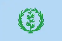 Segundo desenho. Essa alternativa para uma nova bandeira usava a cor azul claro da bandeira das Nações Unidas e um único ramo de oliveira dourado no centro, também da Bandeira/emblema das Nações Unidas, mas com rotação de 30 graus no sentido anti-horário. | |