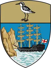 O brasão é composto por um escudo do tipo clássico com partição cortada, ou seja, dividido horizontalmente em duas partes. A parte a superior, com um terço da altura total do escudo, é amarela e contem a figura de uma batuíra-de-santa-helena (Charadrius sanctaehelenae) virado para a esquerda; a parte inferior, com 2/3 da altura do escudo, mostra uma cena costeira da ilha, um veleiro de três mastros com a ilha montanhosa à esquerda. A cena costeira é tirada do selo colonial da colônia e mostra um veleiro no qual tremula uma bandeira da Inglaterra.[4][7]