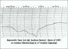 Rastreio típico de um barógrafo. Esse traço em particular mostra como a pressão varia durante uma tempestade severa.