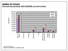 O crescimento populacional da Barra mostra-se constante e acelerado, segundo os censos do Instituto Brasileiro de Geografia e Estatística: 43 945 habitantes em 1980, 98 851 habitantes em 1991, 174 353 em 2000, e 300 823 em 2010.[11] Os números do Censo 2010 indicaram o acelerado crescimento pelo qual a região continuou a passar, concluindo que a região da Barra da Tijuca compreendia 300.823 habitantes em 2010.[3] Entre os bairros da região que mais cresceram destacam-se o Recreio, o Camorim, Vargem Pequena e Itanhangá.[11][12] Considerando-se os dados das últimas três décadas, constata-se que a Barra da Tijuca é uma das regiões urbanas que mais cresceram na América do Sul. Em 1980, a população total da região era de 43 945 habitantes (Joá: 867 habitantes; Barra (bairro): 24 126 habitantes; Itanhangá: 5 028 habitantes; Camorim: 341 habitantes; Vargem Pequena: 3 456 habitantes; Vargem Grande: 4 765 habitantes; Recreio: 5 276 habitantes; Grumari: 86 habitantes).[13] Já em 1991, a população da Barra da Tijuca saltou para 98 851 habitantes segundo o Censo do Instituto Brasileiro de Geografia e Estatística, sendo 823 pessoas no Joá, 9 918 no Itanhangá, 63 492 no bairro da Barra, 145 no Camorim, 3 394 em Vargem Pequena, 6 558 em Vargem Grande, 14 344 no Recreio, e 117 em Grumari), mais que dobrando sua população em uma década.