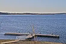 A bacia da barragem situa-se metade dentro do concelho de Elvas (parte de betão) e outra metade no concelho de Campo Maior (parte de aterro).