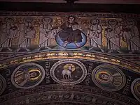 Os mosaicos no arco triunfal sobre o ápice representam Cristo, segurando um livro aberto com o texto "Ego sum Lux vera" ("Sou a luz verdadeira") com os apóstolos, cada um com seu atributo. O arco abaixo contém medalhões em msoaico com o "cordeiro de Deus" e retratos de doze mártires femininos. Ainda existem mosaicos retratando a Virgem Maria e uma criança, sentados no trono dos céus. Uma criança entre Eufrásio e Cláudio está acompanhada pela inscrição "Eufrásio, filho do arquidiácono". Todas as figuras estão em um campo coberto de flores.