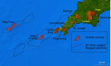 Mapa do Batólito cornubiano de Cornualha (Reino Unido). Destacam-se os principais afloramentos de granito. Os traços descontínuos de 20 mGal de anomalia de Bouguer indicam a localização das anomalias de gravidade negativas associadas às intrusões ígneas na crosta continental.