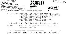 7 de Agosto de 1979; embaixada dos E.U.A. na Argentina; memorando da conversação com "Jorge Contreras", diretor do “Grupo de Trabalho 7” da "Reunião Central" da "Unidade de Inteligência do Exército 601", que reuniu a membros de todos os corpos das Forças Armadas da Argentina. Assunto: "Elementos da repressão do Governo do terrorismo-Subversão. documento original no sítio web do National Security Archive. Segundo o National Security Archive, a Junta Militar, dirigida por Jorge Rafael Videla, acreditava contar com a aprovação dos Estados Unidos para os seus assaltos à esquerda em nome da "doutrina de segurança nacional". A Embaixada dos E.U.A. em Buenos Aires, queixou-se a Washington de que os funcionários públicos argentinos estavam "eufóricos" com os sinais recebidos dos altos funcionários públicos dos E.U.A., incluindo o Secretário de Estado Henry Kissinger [1].