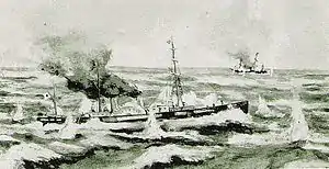 ![]() Encontro entre o Kasuga da marinha Satsuma (primeiro plano), e o Kaiyo da marinha xogunal (segundo plano), durante a Batalha Naval de Awa. | |||