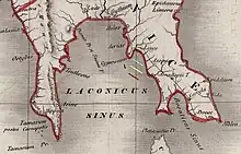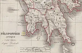 Neste artigo são usados os nomes que podemos ler nas fontes primárias e na subsequente historiografia, na sua maioria italiana dada a presença da República de Veneza nestas partes desde a Idade Média. A península do Peloponeso era nesta altura conhecida por Moreia no Ocidente. A província da Lacónia é também conhecida por Lacedemónia; o golfo da Lacónia, por golfo de Cefalónia. A ilha de Zante é a moderna Zacinto; o porto de Modon é a moderna Metoni; Coron é a moderna Coroni; e a ilha de Cérigo é a moderna Cítera, etc.