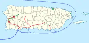 ![]() Mapa da Campanha de Porto, Ilustrando as Operações 25 de agosto a 12 de julho de 1898, e mostrando fronteiras dos municípios em 1898. {Azul} são as Forças Navais dos Estados Unidos, {Vermelho} são as forças terrestres americanas, e {verde} são as forças terrestres espanholas. | |||