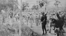 Pouco depois de os soldados americanos desembarcarem, um grupo de espanhóis e unidades de Porto Rico começaram a se mover a partir de Ponce para Aibonito, marchando através da Carretera Central (Estrada Principal). A caravana era composta de duas companhias do Batallón de Cazadores de la Patria (Batalhão de Caçadores da Pátria) e alguns membros da Guarda Civil e uma força de guerrilha de Porto Rico. Um total de 248 homens de infantaria e 42 membros da cavalaria formaram os batalhões sob o comando do tenente-coronel Rafael Martínez Illescas, o mesmo comandante que estava no comando da guarnição de Ponce.[33] Viajando a pé, duraria dois dias. O grupo decidiu passar uma noite no resort da cidade de Coamo conhecido como Baños de Coamo antes de continuar sua marcha pela manhã.[33][34] Martínez Illescas imediatamente ordenou a construção de várias trincheiras; enquanto a construção, os soldados foram emboscados por uma força de guerrilha anti-espanhol, liderado por Pedro María Descartes, que conseguiu matar um membro da Guarda Civil.[33]