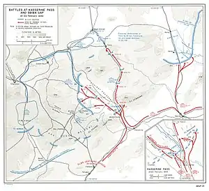 Em 19 fevereiro de 1943, Rommel tendo agora sido dado o controle formal dos 10º e 21º divisões de Panzer, os agrupamentos tácticos da Afrika Korps, bem como as forças do general Messe sobre as defesas da Mareth (agora renomeada Primeiro Exército italiano),[49] lançou o que se tornaria a batalha de Kasserine Pass. Com a esperança de ter os defensores inexperientes de surpresa ele mandou a divisão brindada leve do 3º Batalhão de Reconhecimento. Stark Force do coronel Alexander Stark, um grupo de brigada composta por unidades americanas e francesas, foi o responsável pela defesa da passeagem.[49] Ele não teve tempo para organizar corretamente, mas era capaz de dirigir o fogo de artilharia pesada a partir da altura circundantes, que trouxe principais unidades mecanizadas do agrupamento táctico da Afrika Korps para um impasse.[50] Antes que eles pudessem continuar a infantaria tinha de ser enviada para dentro do terreno elevado para procurar e eliminar a ameaça de artilharia.
